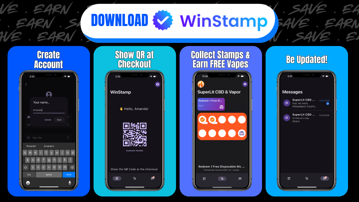 Download WinStamp on the app store and start collecting stamps today. Be able to access the community chat board and earn free disposables overtime!